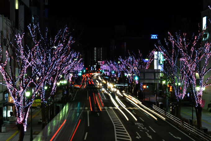3月11日に訪れた、いわき駅前には、原発事故の影響で立ち入りができなくなっている富岡町の桜の名所である夜の森をイメージしたイルミネーションが美しく光っていました。